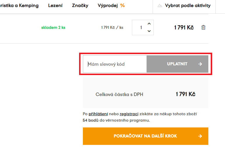 K využití slevového kódu stačí v košíku kliknout na "Mám slevový kupón", zadat jej do pole, které se vám následně zobrazí a potvrdit tlačítkem uplatnit.